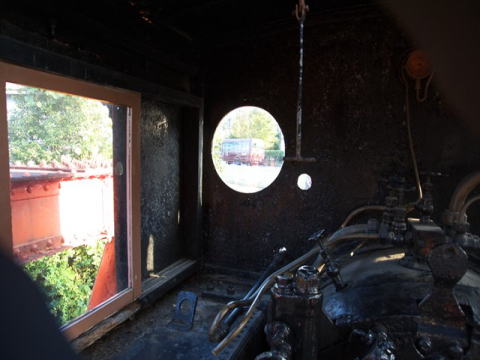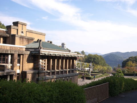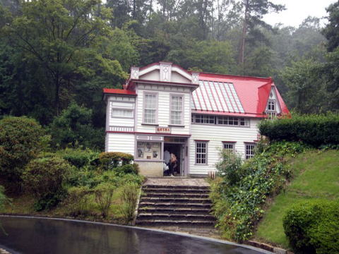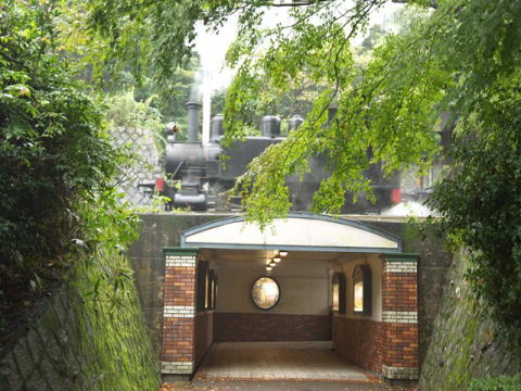 を背に展示されている。尾西線の蒸気機関車が谷を渡るところにある。雨の日も情緒があるが,天主堂では